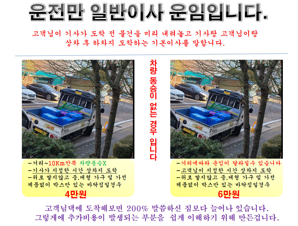 이핑계 저핑계로 엄청난 추가비용을 요구하는곳이 많습니다. 실제 당일이사를 가보면 고객님께서 견적 10만원